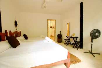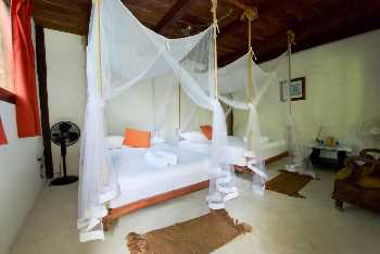 Las habitaciones del Zulum presentan una decoración rústica sencilla con muebles de bambú y de madera. Ofrecen vistas al mar, a la piscina o a la selva.
